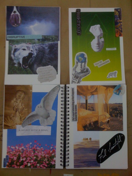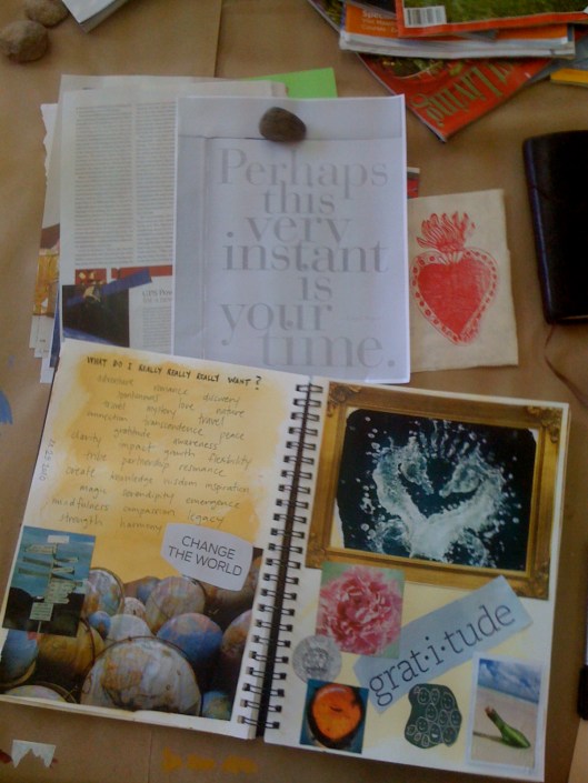 This was the prompt for the first set of pages. There was a time limit to write a freeflow of ideas that came to mind. Probing your heart of hearts, deep down. After the words were written, we were given time to go through magazines and tear out imagery and phrases that resonated with our desires.