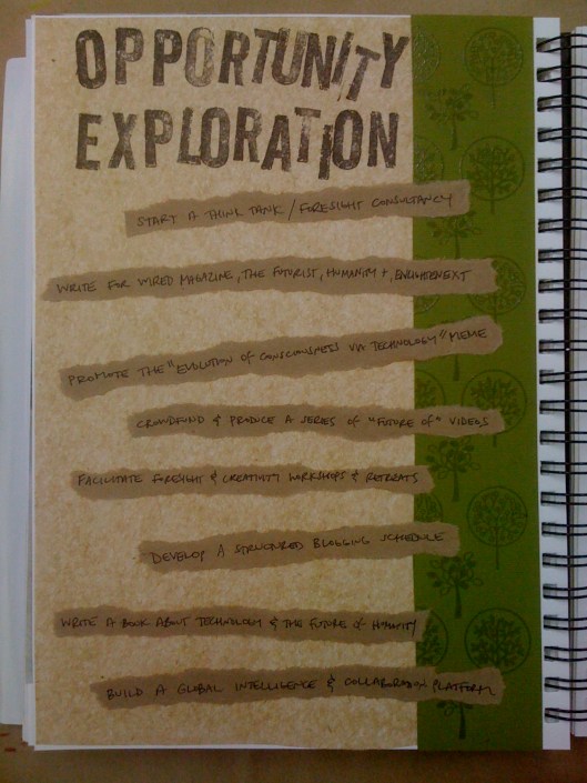 Then we ventured into ‘Opportunity Exploration.’ Looking back at all the pages we’d done so far, and identifying the intersections between ‘heart & meaning’ and ‘gifts & flow,’ we were prompted to just allow ourselves to write down ideas of what we could do to manifest these passions. No pressure to pursue what we write, no fear about putting down ‘crazy ideas’….. just write and see what emerges.