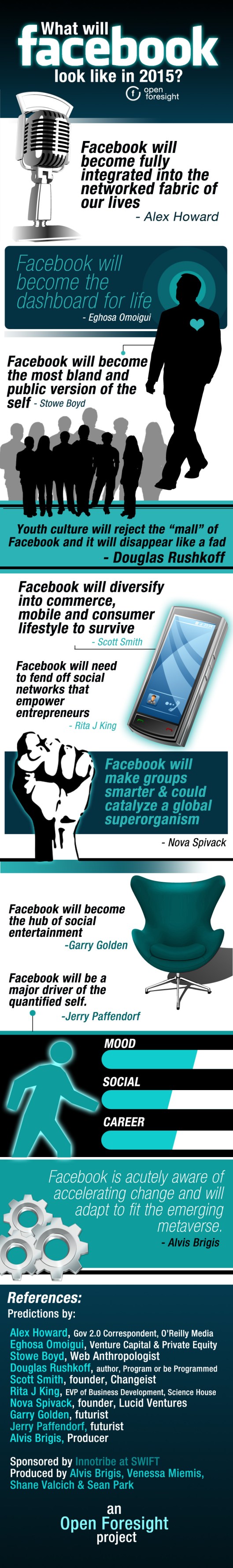 Open Foresight and The Future of Facebook team are pleased to announce the completion of the Future of Facebook interview and video series featuring the likes of David Kirkpatrick (author The Facebook Effect), Kevin Kelly (author What Technology Wants, co-founder Wired), and science journalist Rita J King. The Kickstarter- and patron-funded project, launched in early 2011, has generated a volume of open source Future of Facebook content including 6 Expert Focus Videos, 150 Vision Clips and hundreds of user-generated predictions on Quora. All the material has been made available to academics, students, businesses and other organizations via the Creative Commons Share-Alike 3.0 license.