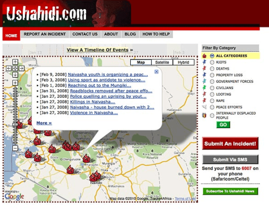 I was thinking something along the lines of Ushahidi meets sustainability. Ushahidi is an open source platform that was originally used to map incidents of violence and peace efforts in Kenya, and has since expanded to be a customizable tool for information collection, visualization, and interactive mapping. With just a mobile phone, you can upload info that gets transformed into a real-time visualization.