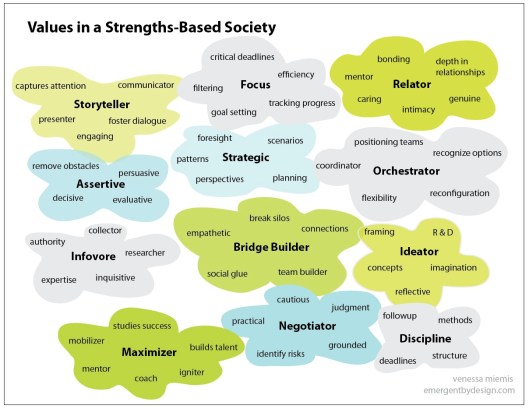 But what happens now that we live in an era where our knowledge, creativity, and ingenuity are being acknowledged as the source of our wealth? What happens when we exchange value as a result of the limitless potential of our strengths? If we shifted the focus, we could each be allowed to develop and excel in the ways we’re naturally inclined to do. If we know what those strengths are and how to harness them, we’ll be able to use the Web more effectively as a tool for learning and for collaboration.